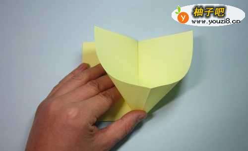 3第3步、将右侧沿着中间的折痕翻折90度,竖立起来。然后将其内部撑开成这个形状。