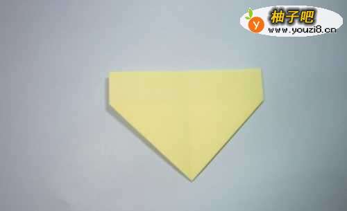 4第4步、将拇指的这一侧往前推下去,然后将两侧压折好,三角形中间的折痕与内部的折痕对齐。