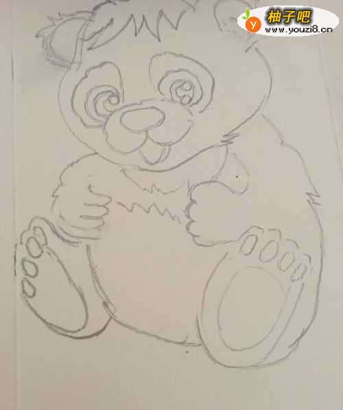 3第三步 再画上熊猫的明亮的眼睛 和它的大黑眼圈 还有黑鼻头 嘴巴 舌头等等