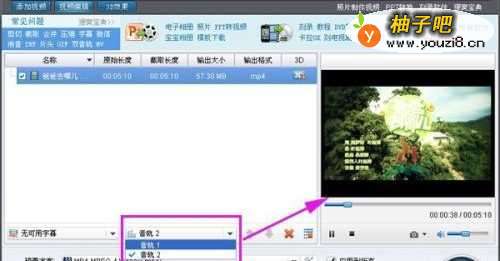 5视频添加后,可以根据下面的“音轨1和音轨2”的选择在右边的播放器上进行预览,“音轨1”就是原视频的背景音乐“音轨2”就是之前步骤上合并添加的新音乐啦。