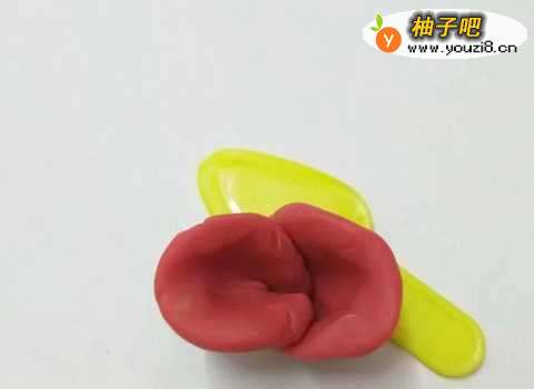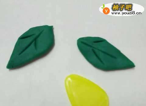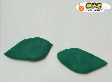 6用两块绿色的捏出两片叶子的大致形状,两头尖,中间宽。
