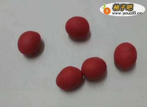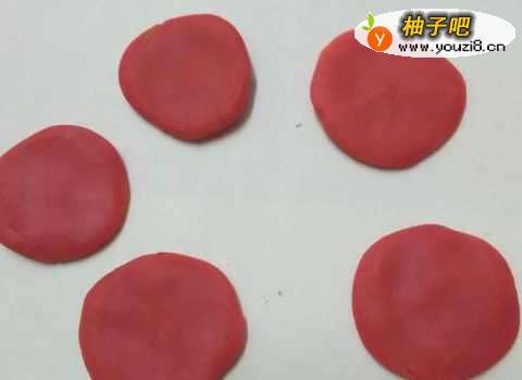3把五个圆球在桌上按成扁片,用来做花瓣。