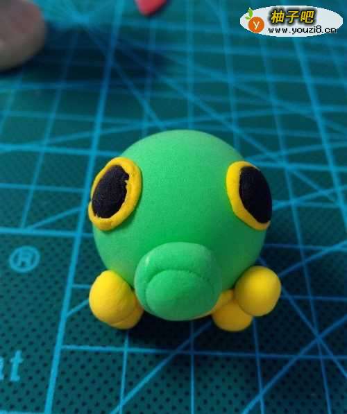 3黑色粘土做绿毛虫的大眼睛,黄色粘土搓成丝状,绕眼睛一圈