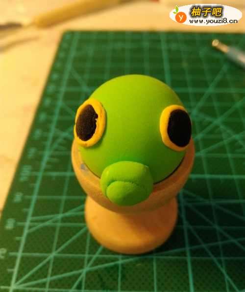 2同样的绿色,搓两个很小的球,其中一个用丸棒压成碗状,用来包裹另一个小球,做成绿毛虫的嘴,贴在身体中间偏下的位置