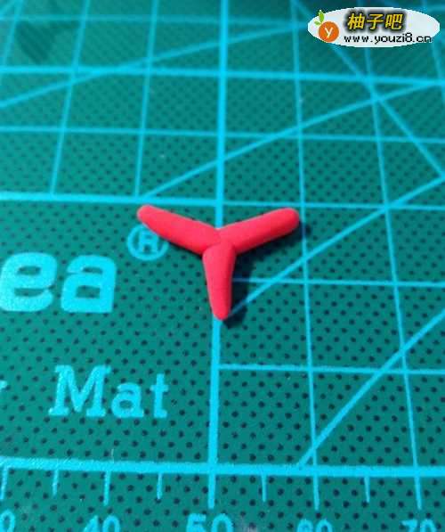 5红色粘土做绿毛虫的触角,先搓三个细条,然后粘在一起