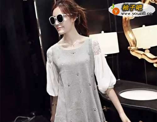 简约的小圆领,百搭不挑人,穿起来露出优美的锁骨线条,很凸显优雅气质,七分袖长,简约大方。,袖部拼蕾丝、雪纺材质,凸显出了服装的独特性。