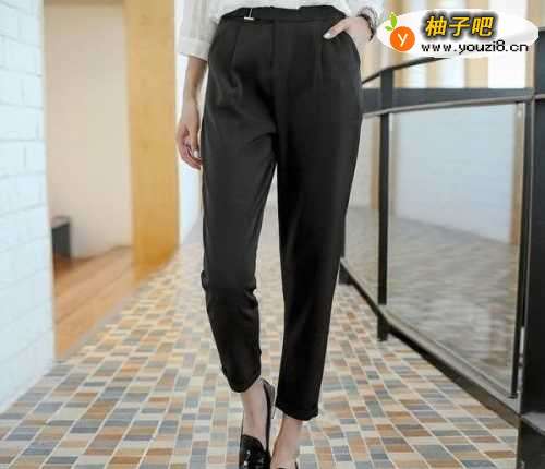 8高腰哈伦裤版型,腰部前身布衣拉链收门襟,方便穿着搭配半截暗扣金属腰带,增加造型感,前身两时尚插袋,美观实用。