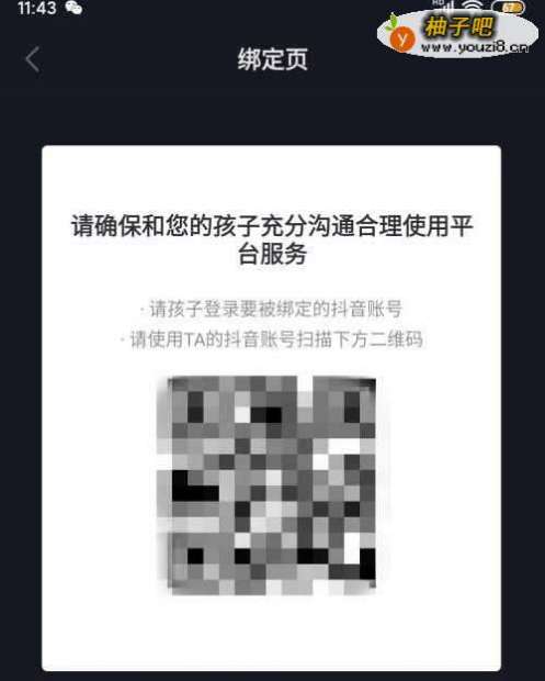 5点击后,会进入绑定页面,在和孩子充分沟通后,使用孩子的抖音账号扫描绑定页面的二维码,如下图所示:
