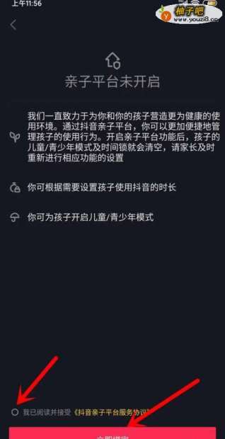 4接着,在弹出的页面勾选最下方的《抖音亲子平台服务协议》并点击立即绑定,如下图所示: