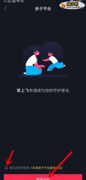 6扫描二维码后,在弹出的页面中勾选《抖音亲子平台服务协议》并点击接收守护,即可成功开启亲子平台。如下图所示: