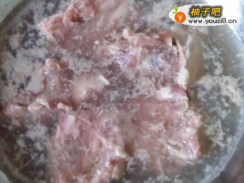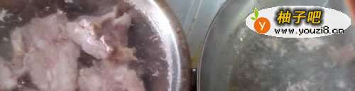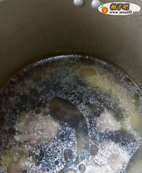 2将猪骨放小锅里加清水,煮至漂起许多浮沫
