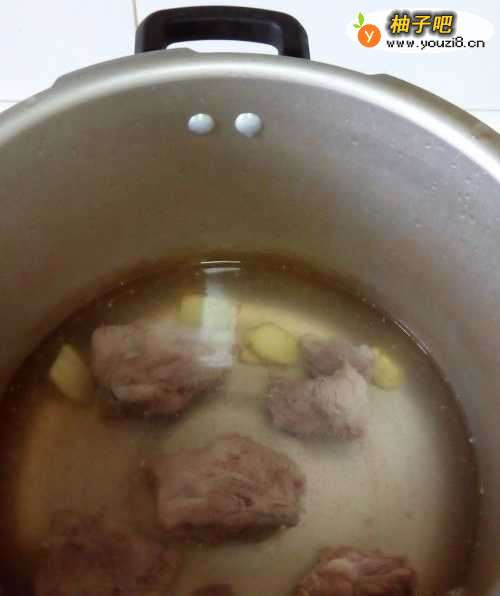 4夹起去掉浮沫的猪骨放进高压锅,倒入适量开水,加入姜片,少许香醋,盖上盖子,开大火熬煮。(我这是为了省时间,其实用汤煲炖更好,方法步骤是一样的,只是时间要长些)