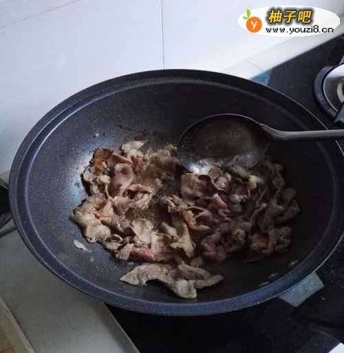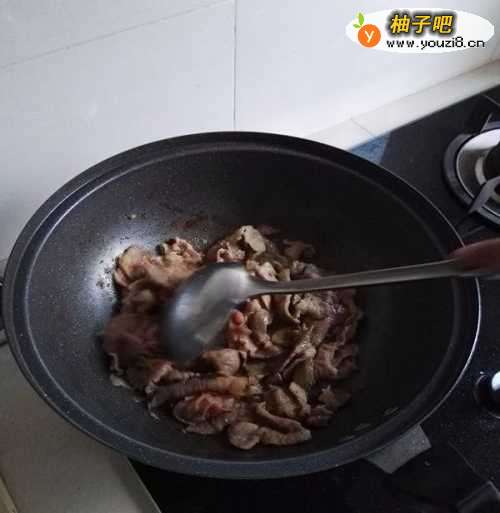 3放上切好的猪肉片中火来回翻炒,如果切的肉片厚点的话就炒的时间长一点,很薄的话五六分钟即可,炒的肉全部变了色之后就说明炒的差不多了。