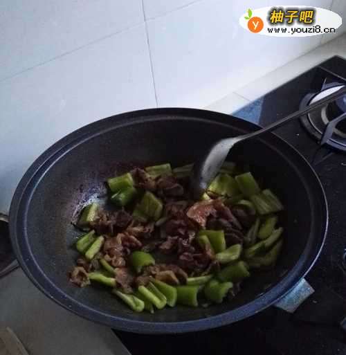 5放入尖椒,继续翻炒,再炒大概三四分钟就可以了,尖椒不用炒的时间太长了,炒过头反而不好吃了,尖椒的味炒出来就行了。