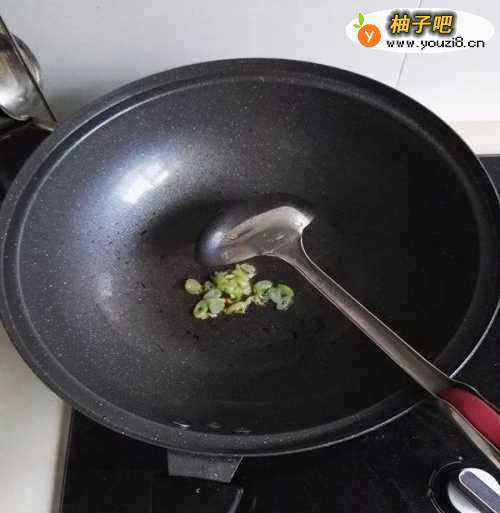 猪肉、尖椒、葱洗好切片备用,往炒锅里倒上适量花生油,点火热锅,把切好的葱花放入锅内,熟一下锅,把葱花的香味炒出来。