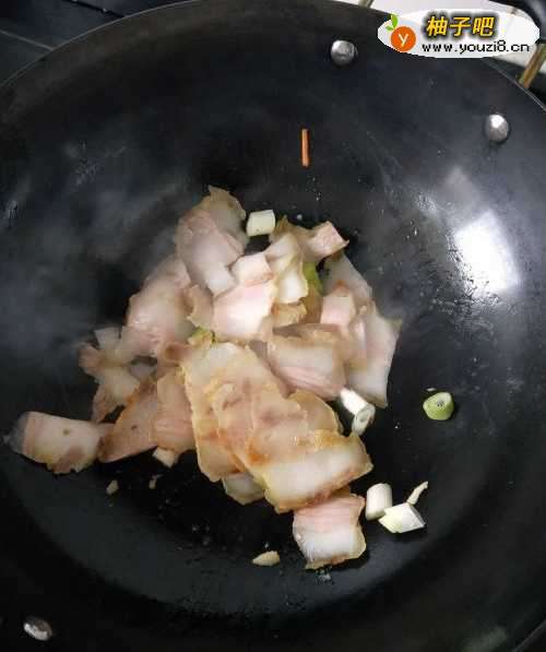 4净锅放肉,煸出多余的油脂。吃起来不会油腻。然后把多余的油脂倒出一些,锅里留少许的油。