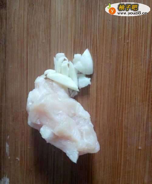 3第三步;将肉洗干净,切成丝状,蒜切成片状。然后备用,家里有红薯粉的,抓点腌制一下肉。