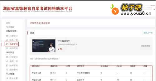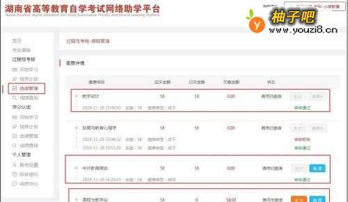 学员登录后进入首页 → 点击【选课管理】显示报考的课程,如下图所示:
