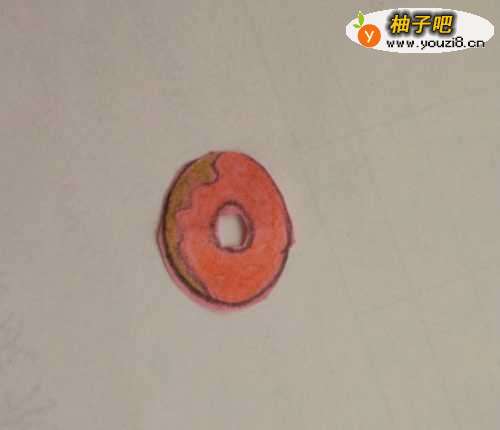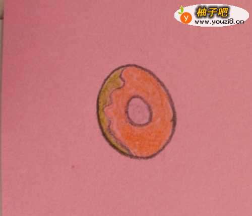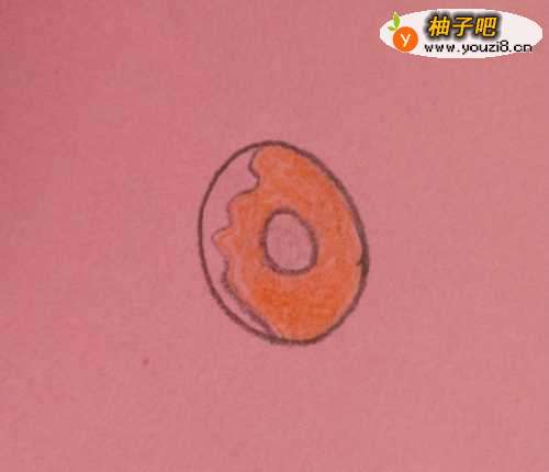 4如图,用桔色彩铅笔把甜甜圈涂上颜色。