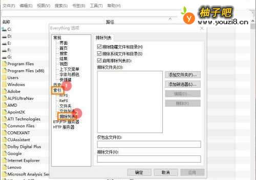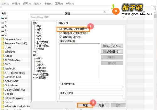 3在排除列表页面,勾选【排除隐藏文件和目录】,点击【确定】即可。