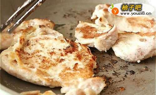 4以大火烧热油,下猪排煎至两面金黄色后,调至中火,每1分钟把猪排翻面一次,煎至猪排熟透。