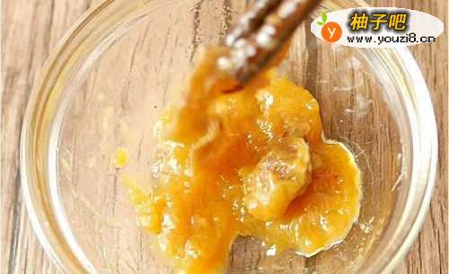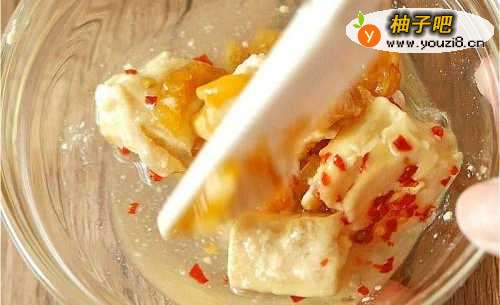 3做酱汁的部分,把热水加入糖中,搅拌至糖溶化。把糖水、酸梅加入腐乳中搅拌至顺滑。