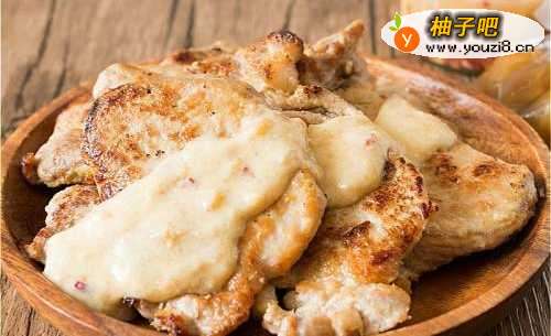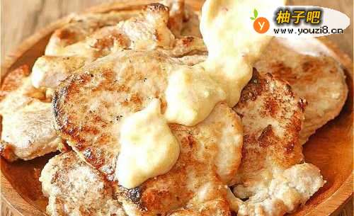 5煎好后把猪排装盘,可以把酱汁直接淋上去或用猪排沾着酱汁来吃。