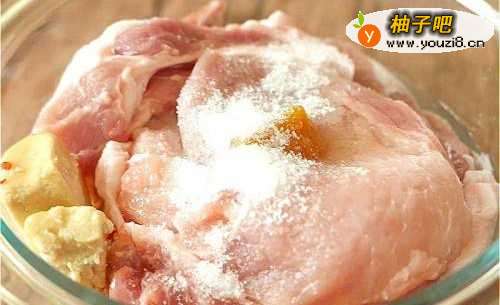2把蛋白、腐乳、酸梅和糖加到猪排中,用手按摩至腌料被猪排吸收。然后加入生粉按匀后,最后加入麻油按匀。包好腌1小时以上。