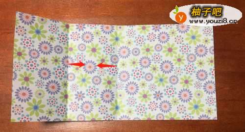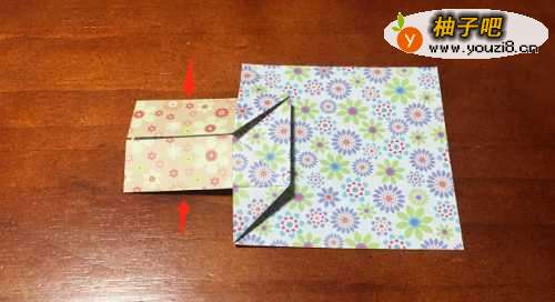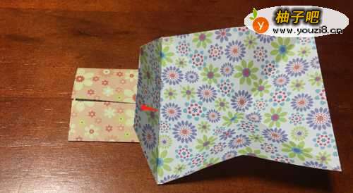 2取半张彩纸,纵向对折,左半边再对折,然后将红色箭头标注(下图1)处,对折成图2,将拱起的彩纸往右压下去。