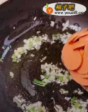 4油热放葱蒜炒香,放火腿稍微炒几下。