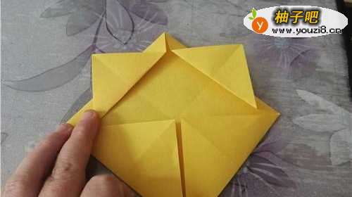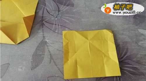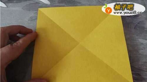 我们先把彩纸的两角对折,再把四个角向内折,如下图的样子。