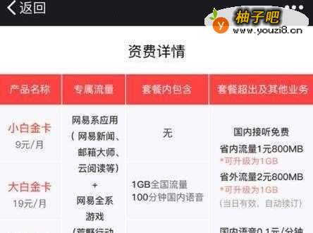 4然后,小白金卡,月租9元,网易系应用和游戏免流,日租宝套餐省内1元1GB,国内2元1GB,当日有效。