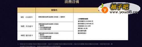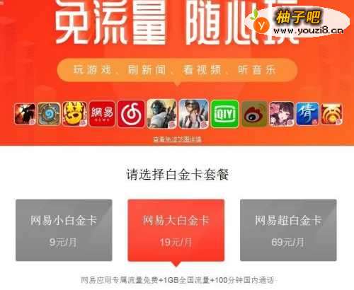 6最后,超白金卡:月租69元,5GB全国流量和300分钟国内语音,网易系应用和游戏免流,日租宝套餐同上。