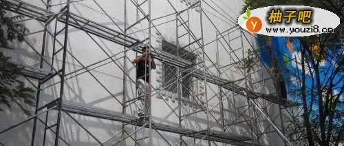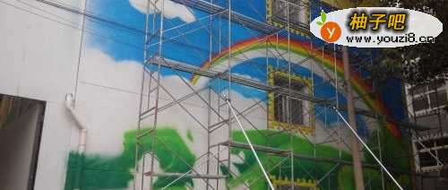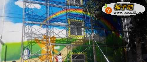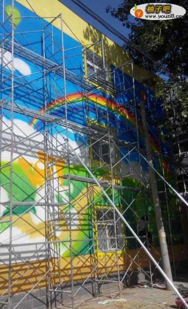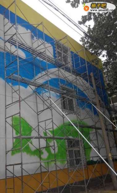 6这样这幅墙绘就完成了 工人师傅拆去架子效果如图