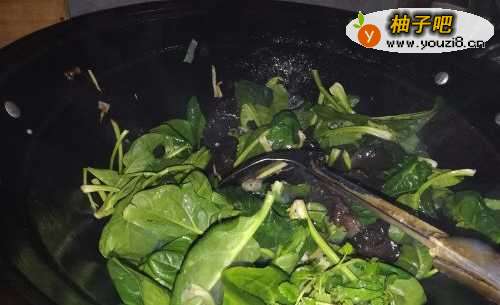 5把菠菜加入木耳中进行翻炒,放入适量盐,翻炒。