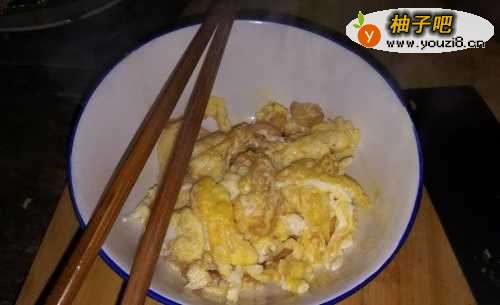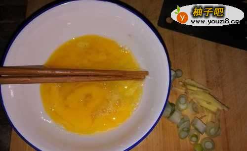 2在鸡蛋中放入少量盐后打散,葱姜切丝,锅内放油先将鸡蛋炒成块。鸡蛋一成块就盛出来,炒时间长了口感不好。