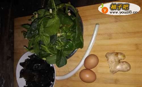 首先,准备食材,将木耳、菠菜、葱、姜等清洗干净,放在一起待用。