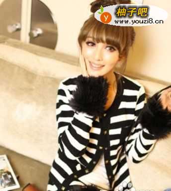 2条纹元素依旧走俏,黑白条纹非常大气也很百搭,铆钉扣则增添了几分个性。这款开衫的特别之处在于袖口的毛绒,很贵气的感觉。