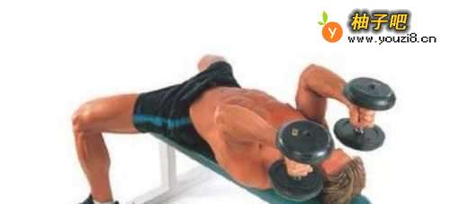 1.仰卧在地面或训练椅上,握住哑铃,在头后方慢慢下降,双手对握。