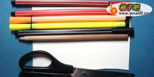 制作漂亮的卡通孙悟空卡片的工具和材料的准备,有白色的卡纸、铅笔、彩色笔和剪刀、橡皮,如下图所示。