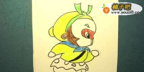 5接着,用橘色的彩色笔给卡通孙悟空的帽子和衣服涂上颜色,并用绿色彩色笔给围巾涂上颜色,这样图形就生动形象好看了,如下图所示。
