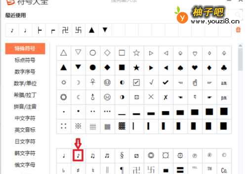5这时候会弹出【符号大全】的对话框,点击【特殊符号】,然后在中间下面就可以找到八分音符符号【♪】,点击它即可