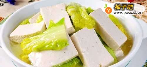 豆腐含蛋白质40%~60%,吸收消化率可达90%以上,只含豆固醇不含胆固醇。在白菜作用下,既促进B族维生素吸收,又增加钙、赖氨酸,有利于壮骨强筋,防止骨质疏松,降低胆固醇。白菜与豆腐同食,特别适宜大小便不利、咽喉肿痛、支气管炎等患者食用。