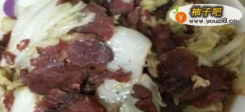 荤素搭配,互为补充,营养全面,具有健脾开胃之效,特别适于体虚者食,对体弱乏力,肺热咳嗽有辅助治疗作用。同时牛肉有丰富的蛋白质和其他营养成分,可补脾胃、益精血;白菜粗纤维丰富,可促进肠胃蠕动,防止便秘。