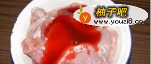 2将处理好的里脊肉放入大碗中,倒入200ML左右的叉烧酱,拌匀。