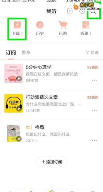 3如果还未有下载过喜欢听的书,可以先点击右上角的放大镜先搜索自己喜欢听的书。如果已经下载过书,可以点击左上角的“下载”先下载好要听的书。