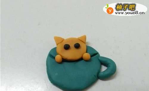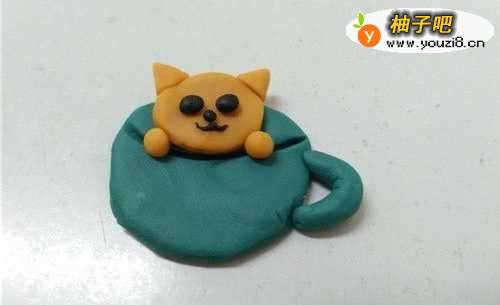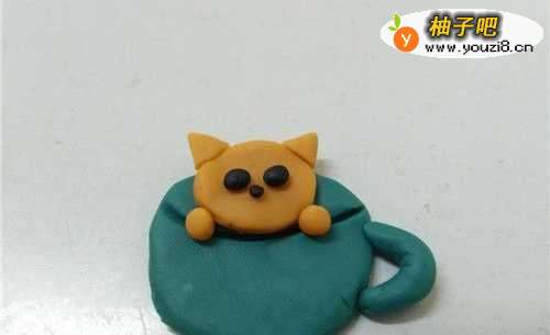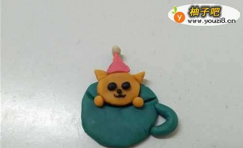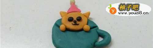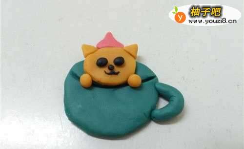 1、先用蓝色彩泥捏杯子和杯把儿。2、用桔色彩泥捏小猫的头、爪子、眼睛、鼻子和嘴。3、用粉色彩泥捏帽子。4、用白色彩泥捏帽子上的绒球。