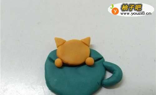 4用浅桔色捏一个椭圆形,粘在杯口上方,当作小猫的头。