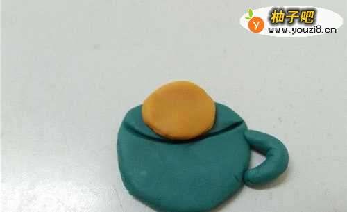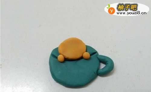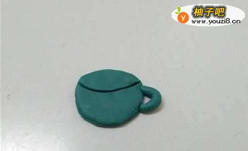 3用蓝色彩泥搓一个圆圆的小条,弯成弧形,粘在椭圆形右侧,当作茶杯把儿。