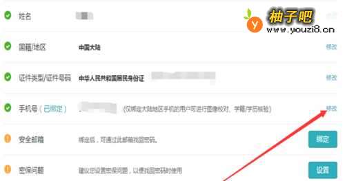 5切换到账号管理的界面中显示自己的基本信息状态,在手机号栏中单击“修改”选项。
